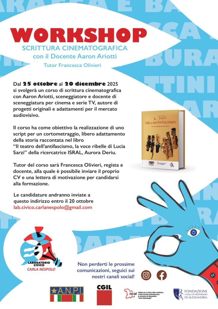 Il workshop è parte integrante del progetto “Baracca e Burattini”, realizzato dal Laboratorio “Carla Nespolo”, da Isral, CGIL, Anpi provinciale di Alessandria con il sospegno della fondazione Cassa di Risparmio di Alessandria, e ne costituisce la seconda azione. La prima, una ricerca storica condotta dalla giovane ricercatrice Isral Aurora Deriu, costituisce il fondamento per questa seconda parte, dedicata ai giovani che desiderano una formazione in ambito di scrittura cinematografica.