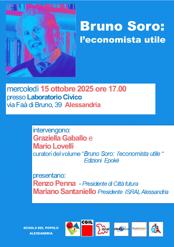 Mercoledì 15 ottobre 2025 alle ore 17 presso il Laboratorio Civico in via Faà di Bruno 39 ad Alessandria verrà presentato il volume “Bruno Soro: l’economista utile” (Edizioni Epokè). Interverranno Graziella Gaballo e Mario Lovelli (curatori del volume) e lo presenteranno Renzo Penna (Presidente di Città Futura) e Mariano Santaniello (Presidente Isral).