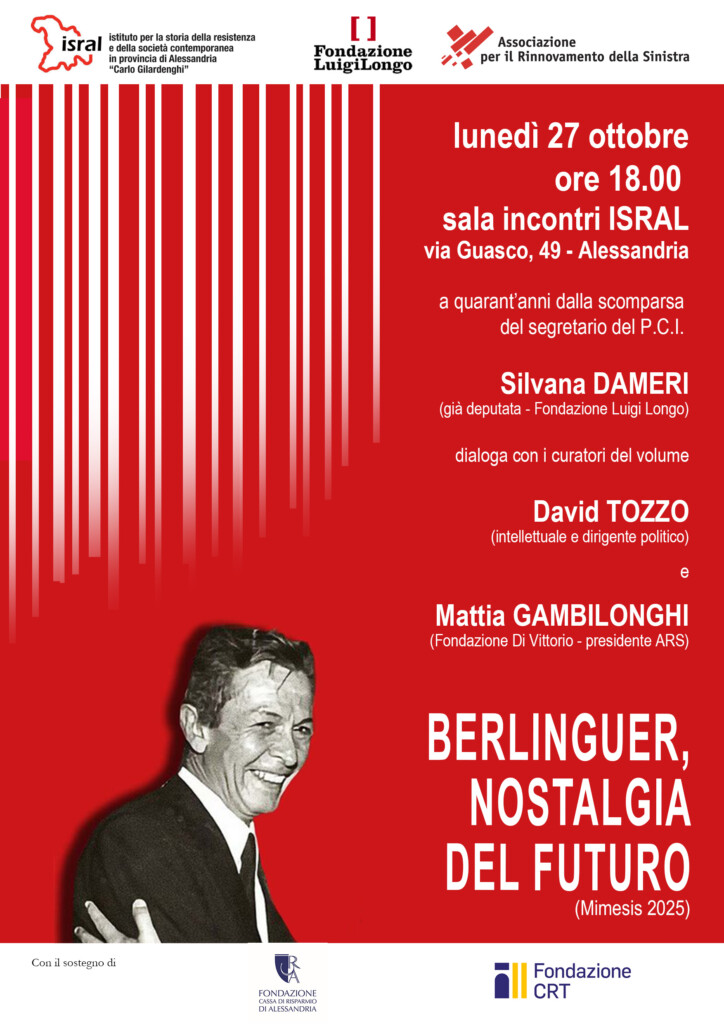 Lunedi 27 Ottobre 2025 alle ore 18,00 presso la sala Incontri Isral (via dei Guasco 49, Alessandria), a quarant’anni dalla scomparsa del segretario del P.C.I., Silvana Dameri (già deputata, Fondazione Luigi Longo) dialogherà con i curatori del volume “Berlinguer, Nostalgia del Futuro” (Mimesis, 2025) David Tozzo (intellettuale e dirigente politico) e Mattia Gambilonghi (Fondazione Di Vittorio, presidente ARS).