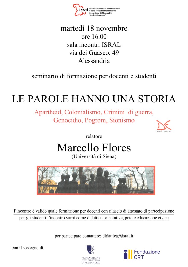 L’incontro avrà valore formativo per i docenti i quali riceveranno regolare attestato. La partecipazione degli studenti (soprattutto delle classi terminali della secondaria di primo e secondo grado) è auspicabile in quanto l’incontro verterà sul lessico della storia a partire dal volume “Le parole hanno una storia: Apartheid, Colonialismo, Crimini di guerra, Genocidio, Pogrom, Sionismo” dello stesso Flores. Per gli studenti che parteciperanno le ore potranno valere come didattica orientativa, pcto ed educazione civica.