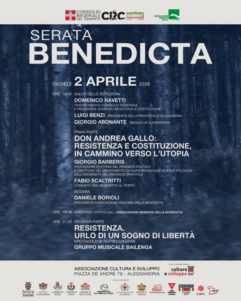 Si segnala che giovedi 2 aprile 2026 presso Associazione Cultura e Sviluppo, piazza de Andrè 76, Alessandria, si terrà la Serata Benedicta.