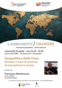 Mercoledi 29 aprile dalle ore 16:30 alle 18: 30 presso sala incontri Isral di Alessandria in via dei Guasco 49 si terrà il secondo incontro della nostra rassegna di geopolitica con il prof. Francesco Montessoro (storico dell’Asia, Università di Milano) dal titolo: “Geopolitica della Cina: frontiere e zone di interesse di una potenza in ascesa”. L’incontro è aperto alla cittadinanza e vale come formazione docenti (con rilascio di attestato di frequenza).