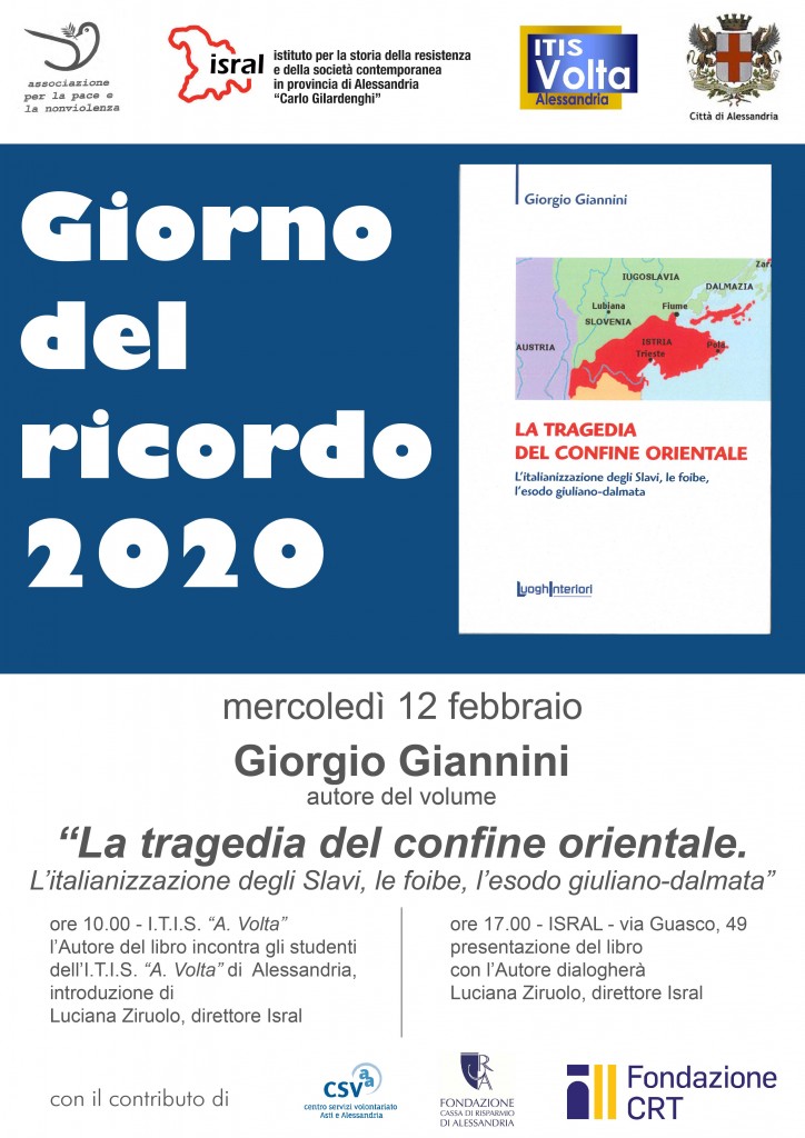 Mercoledì 12 febbraio 2020, alle ore 17, nei locali dell’Isral in via Guasco 49 ad Alessandria sarà presentato il volume di Giorgio Giannini La tragedia del confine orientale. L’Italianizzazione degli slavi, le foibe, l’esodo giuliano – dalmata (Luoghi Interiori, 2019)