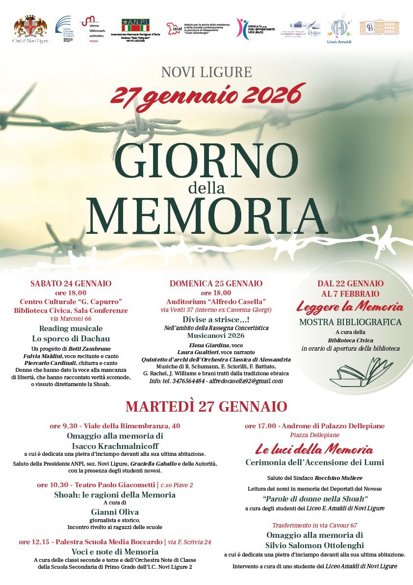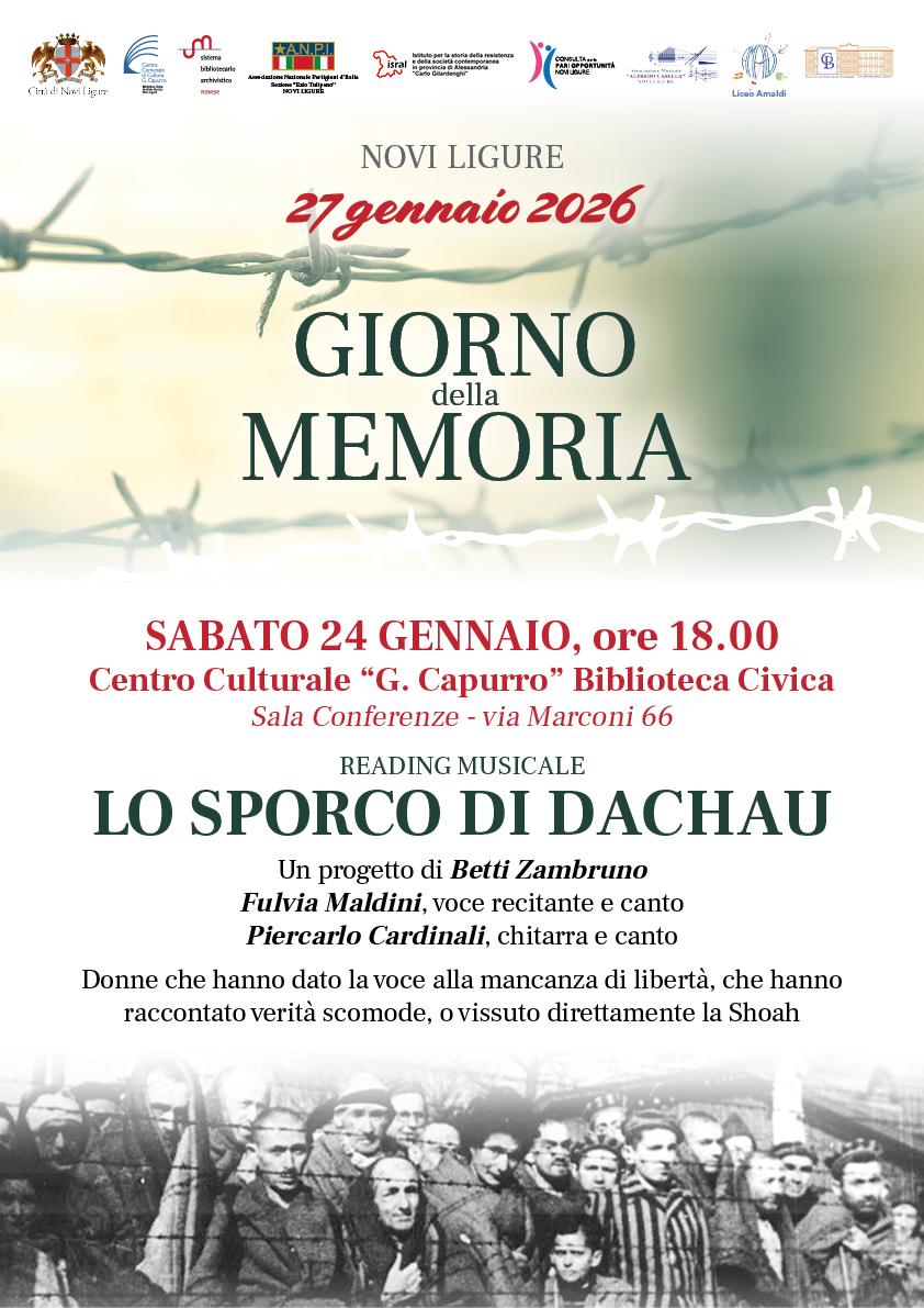 A fianco anche il programma di Novi Ligure, dove si segnala sabato 24 gennaio presso il centro Culturale Capurro, via Marconi 66, lo spettacolo Lo sporco di Dachau un progetto di Betti Zambruno a cura di Fulvia Maldini e Piercarlo Cardinali