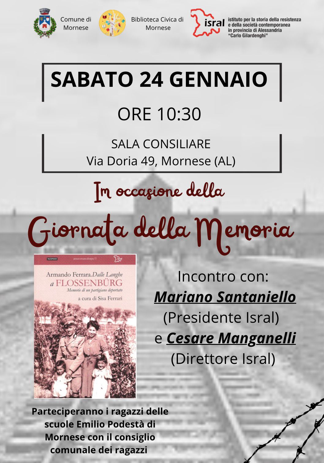 Il giorno 24 gennaio alle ore 10,30 presso la Sala Consiliare a Mornese Cesare Manganelli e Mariano Santaniello terranno un intervento per il Giorno della Memoria con le scuole medie Emilio Podestà e il consiglio comunale dei ragazzi