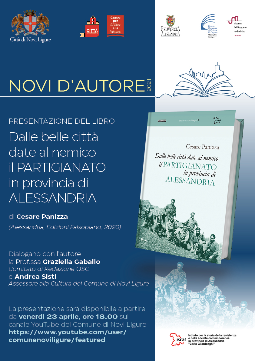 Venerdì 23 aprile 2021, dalle ore 18,00, nell’ambito della rassegna Novi d’Autore organizzata dall’Assessorato alla Cultura del Comune di Novi Ligure, sarà presentato il libro di Cesare Panizza Dalle belle città date al nemico. Il partigianato in provincia di Alessandria. (Falsopiano 2020). In dialogo con l’autore sarà Graziella Gaballo, del Comitato di redazione di QSC. Alla presentazione partecipano l’Assessore alla cultura Andrea Sisti del comune di Novi Ligure e il direttore dell’Isral Luciana Ziruolo.