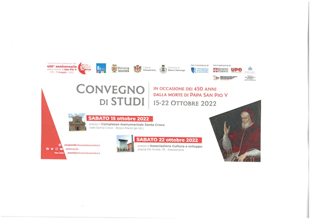 In occasione del 450° anniversario della morte di Papa San Pio V (1572 – 2022), la Diocesi di Alessandria, la Provincia di Alessandria, il Comune di Alessandria e il Comune di Bosco Marengo, con il patrocinio di UPO e dell’Isral, hanno costituito un Comitato per le celebrazioni.