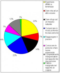 Per la quasi totalità dei presenti (17/18 ) prioritaria è la maturazione interiore per una crescita personale; quindi importante è il bisogno di essere compresi, amati e protetti (12/18 ); infine la soddisfazione sessuale (5/18 ).Non mancano poi coloro che vivono il rapporto come occasione per uscire dal proprio ambiente oppure per sistemarsi (3/18) o, curioso per accrescere l’autostima (2/18). Un caso solo riconosce al rapporto la finalità del procreare.