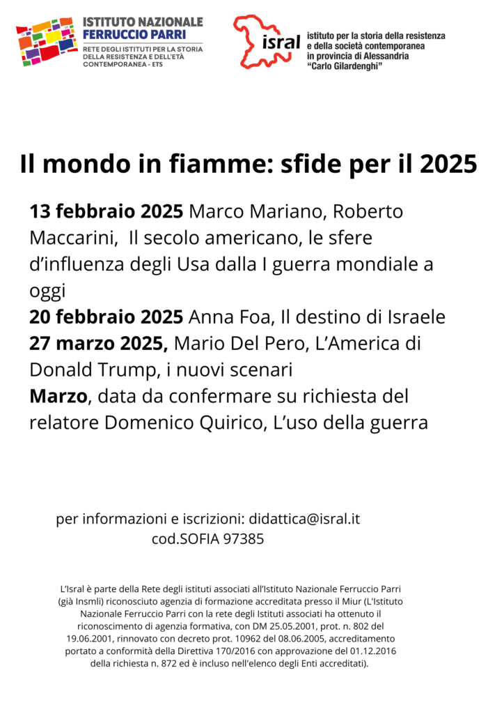 In presenza di un quadro politico internazionale particolarmente travagliato, l’Isral organizza, per il secondo anno consecutivo, una serie di lezioni finalizzate alla conoscenza dei principali nodi geopolitici che segnano la situazione politica mondiale di quest’anno, a partire dall’insediamento negli Stati uniti di un nuovo presidente, accompagnate da indicazioni su modalità e strumenti utili per una didattica partecipata.
