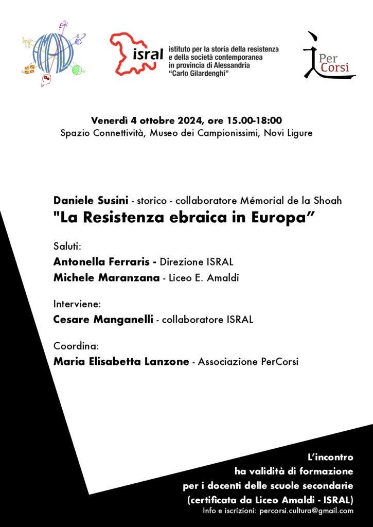 Venerdì 4 ottobre 2024, dalle ore 15.00 alle ore 18.00 presso lo Spazio Connettività del Museo dei Campionissimi Novi Ligure viale dei Campionissimi 2, a Novi Ligure, si terrà un incontro di formazione dal titolo La resistenza ebraica in Europa. Relatore Daniele Susini, a partire dal suo fortunato saggio dallo stesso titolo edito da Donzelli. Con lui Cesare Manganelli direttore della Biblioteca Isral. Interventi di Antonella Ferraris, direttrice Isral e Michele Maranzana, dirigente del Liceo “Amaldi” di Novi Ligure.