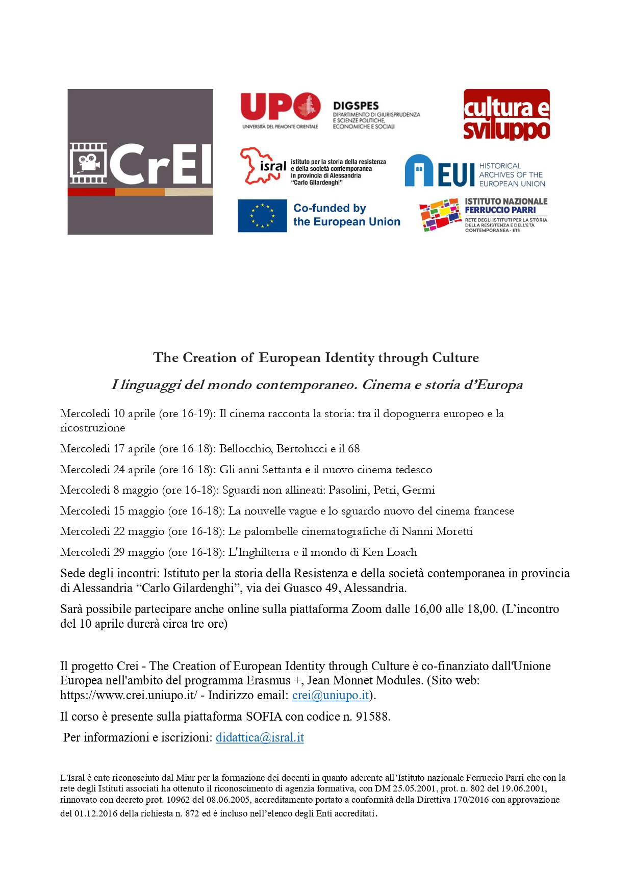 L’Università del Piemonte Orientale – Dipartimento di Giurisprudenza e Scienze Politiche ed Economiche e l’Isral, in collaborazione con l’Associazione Cultura e Sviluppo e gli Archivi Storici dell’Unione Europea Union, promuovono il corso di formazione seconda parte del progetto iniziato nel mese di ottobre 2023The Creation of European Identity through Culture. I linguaggi del mondo contemporaneo. Cinema e storia d’Europa,