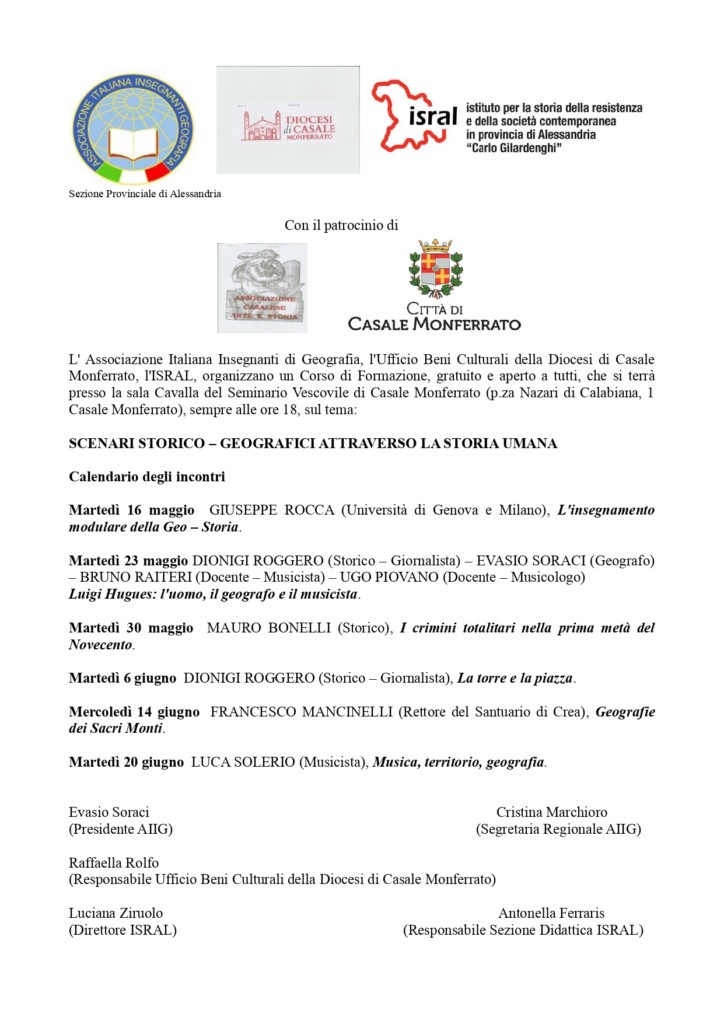 L’ Associazione Italiana Insegnanti di Geografia, l’Ufficio Beni Culturali della Diocesi di Casale Monferrato, l’ISRAL, organizzano un Corso di Formazione, aperto a tutti, che si terrà in presenza presso la sala Cavalla del Seminario Vescovile di Casale Monferrato (p.za Nazari di Calabiana, 1 Casale Monferrato), sempre alle ore 18, sul tema:
