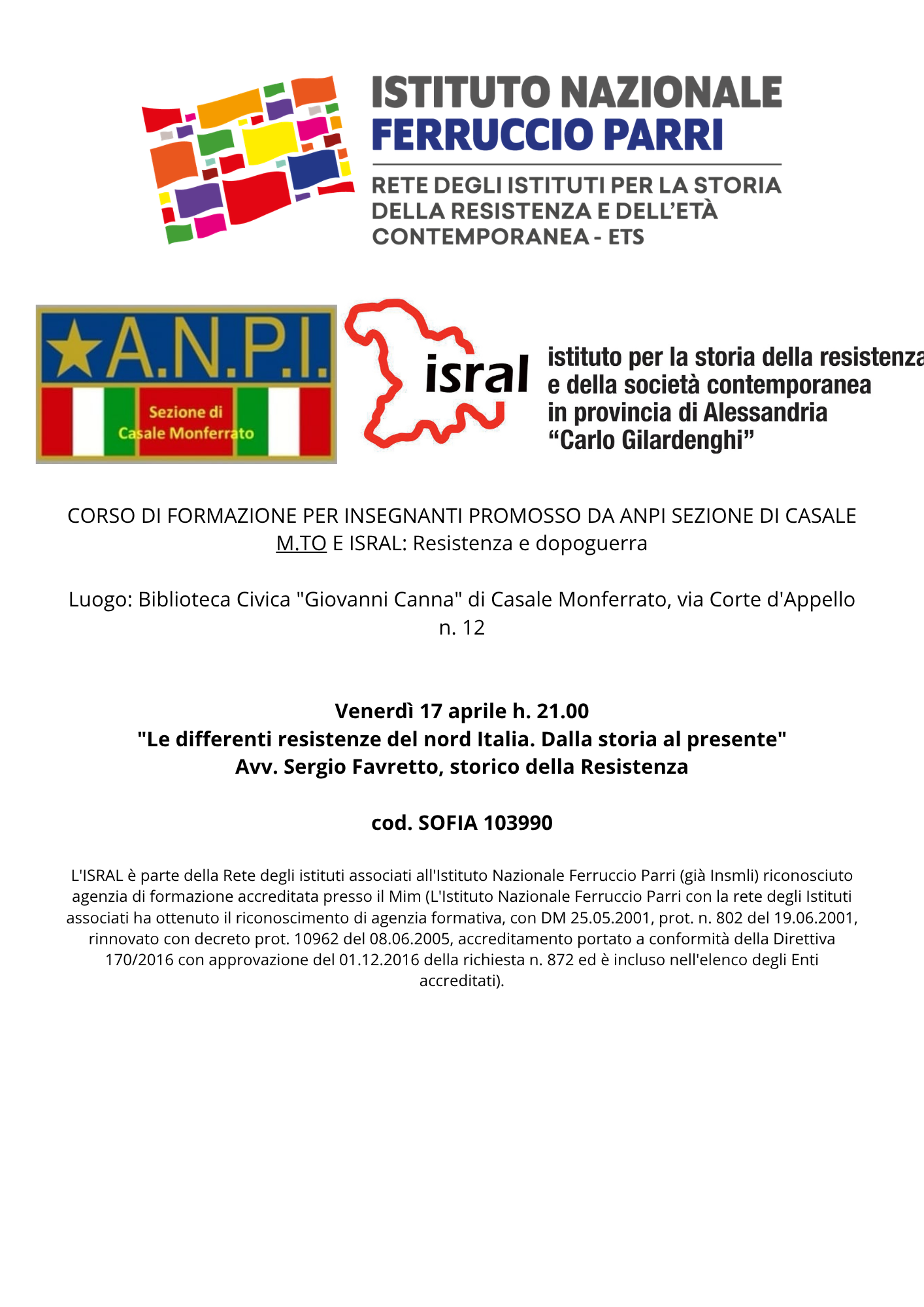 Gli incontri hanno valore di formazione per gli insegnanti e sono pubblicati sulla piattaforma SOFIA con il codice 103990. Oltre al corso è previsto un follow up per progettazione, sperimentazione di attività, restituzione, a cura dell’Isral per altre 8 ore. Le ore di autoformazione saranno certificate sulla base di un breve progetto redatto dai partecipanti