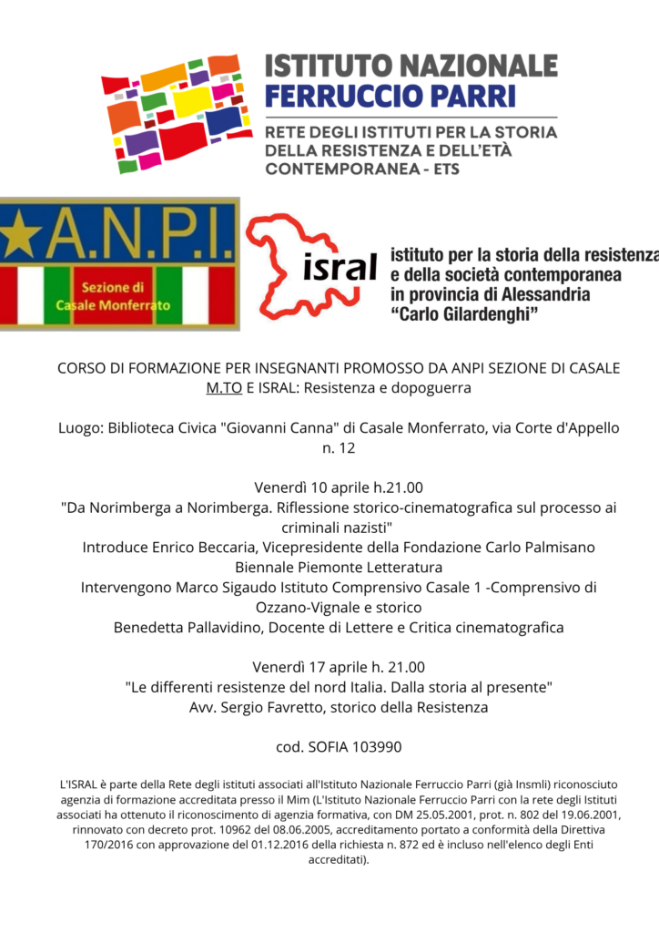 L’Isral in collaborazione con la sezione Anpi di Casale Monferrato organizza due incontri, indirizzati ai docenti, ma aperti a tutti gli interessati sul tema della resistenza e del dopoguerra