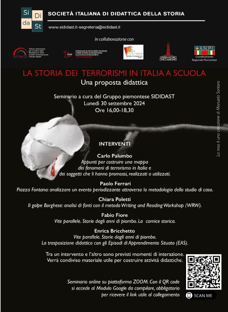 Il Gruppo piemontese della Società italiana di Didattica della Storia (SiDiDast) organizza il 30 settembre prossimo un seminario online dedicato alla Storia dei Terrorismo in Italia a scuola, una proposta per incorporare lo studio degli ultimi trent’anni del secolo scorso nella programmazione didattica.