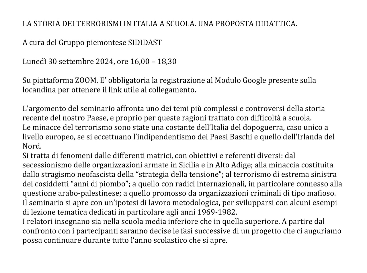Seminario del Gruppo piemontese SiDiDast – La storia dei terrorismi in Italia a scuola. Una proposta didattica