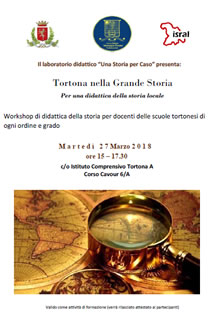 Il 27 marzo a Tortona dalle ore 15.00 alle ore 17.30 presso l’Istituto Comprensivo Tortona A, in corso Cavour 6/A il laboratorio didattico “Una Storia per Caso” presenta ” Tortona nella Grande Storia. Per una didattica della storia locale”