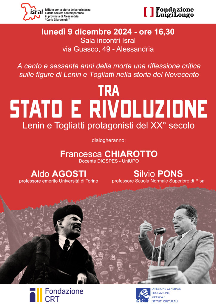 Cento anni fa moriva Lenin, artefice della Rivoluzione di Ottobre; sessant’anni fa ci lasciava Palmiro Togliatti: due figure che hanno cambiato la storia del mondo , e anche dell’Italia. Per ricordare l’impatto di questi due personaggi l’Isral organizza un incontro seminariale di formazione, aperto a tutti, il 9 dicembre 2024, alle ore 16.30, presso la sala incontri dell’Isral in via Guasco 49, Alessandria, dal titolo